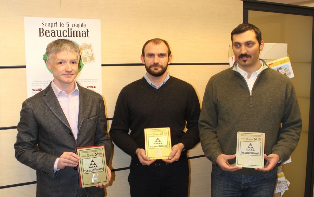 Sono state consegnate in questi giorni le prime tre targhe energetiche in classe A+ per edifici certificati con il metodo regionale Beauclimat. Il primo edificio, di proprietà della società FC Service s.r.l., nel comune di Charvensod, è costituito da uffici di nuova costruzione, aventi un involucro opaco con trasmittanza di circa 0,15 W/m2K, impianto di climatizzazione invernale con pompa di calore di tipo acqua – acqua e impianto fotovoltaico con moduli policristallini di circa 25 kWp.