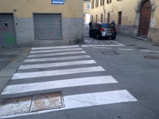 Per non parlate poi del genio che ha disposto le ‘zebre’ per l’attraversamento di via Via Hôtel des États all’incrocio con via Mons. De Sale, due strade particolarmente frequentate dai bambini vista la vicinanza della scuola. Come si vede nelle foto le zebre terminano davanti alla vetrina di una libreria e chi vuole proseguire in via mons. De Sale rischia di essere travolto dagli automezzi che giungono da piazza Giovanni XIII. Dal citato incrocio, dove inizia la Ztl, la carreggiata, peraltro stretta, non ha alcuna limitazione per il traffico veicolare a salvaguardia dei pedoni.