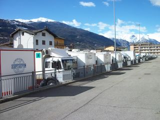 La retrostante piazza Mazzini è un unico parcheggio di Tir, ma – delusione!- sono tutti mezzi italiani, nessuna motrice tutta cromature con il grande cofano prominente tipica dei “bisonti della strada” americani come sembrava dovesse essere. In un recinto sono custodite diverse bombole di gas da cucina ed alcuni barilotti di petrolio.