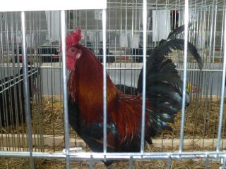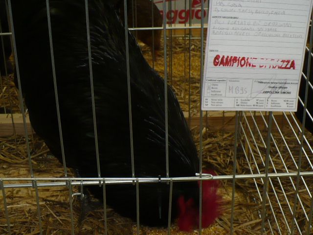 La giuria esaminatrice osserva la postura del volatile, lo sviluppo del piumaggio, il colore delle piume e tutti gli eventuali difetti presenti sul pollo, che lo allontano dallo standard di riferimento della razza a cui appartiene. Se hai fatto un giro attento delle gabbie avrai notato che sono pochi i soggetti valutati come campioni di razza, ossia che hanno poche imperfezioni e rispettano gli standard prefissati per la razza. Ci sono circa 20 campioni di razza, ma solo due hanno ricevuto la valutazione D96 [Distinto con valutazione di 96, ndr], ossia la seconda più alta dopo l’E97 [Eccellente, valutazione di 97, ndr].