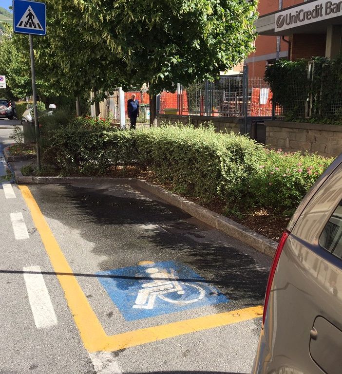 Lo stallo municipale per i disabili c'è, ma si trova incuneato tra una voluminosa aiuola e il posteggio a riga blu. Un'auto può riuscire a parcheggiare ma se, come accade quasi sempre, il posteggio blu è occupato da un'altra vettura, lo stallo disabili diventa inutilizzabile perchè non c'è spazio per far uscire dal bagagliaio la carrozzina.