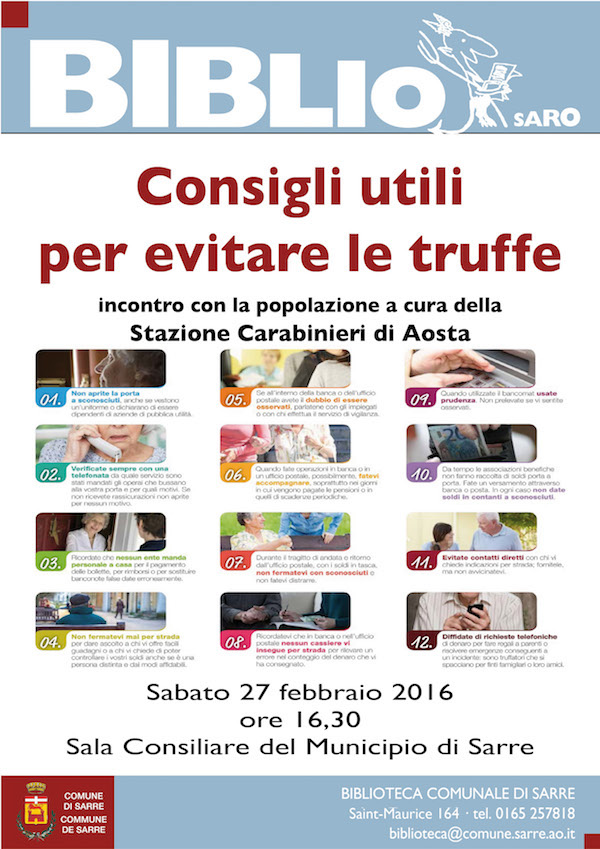 Per meglio informare la popolazione, l’Amministrazione di Sarre in collaborazione con la Biblioteca ha organizzato, per sabato 27 febbraio, alle ore 16,30 un incontro pubblico nel corso del quale i Militari dell’Arma spiegheranno i comportamenti da tenere per prevenire le truffe.