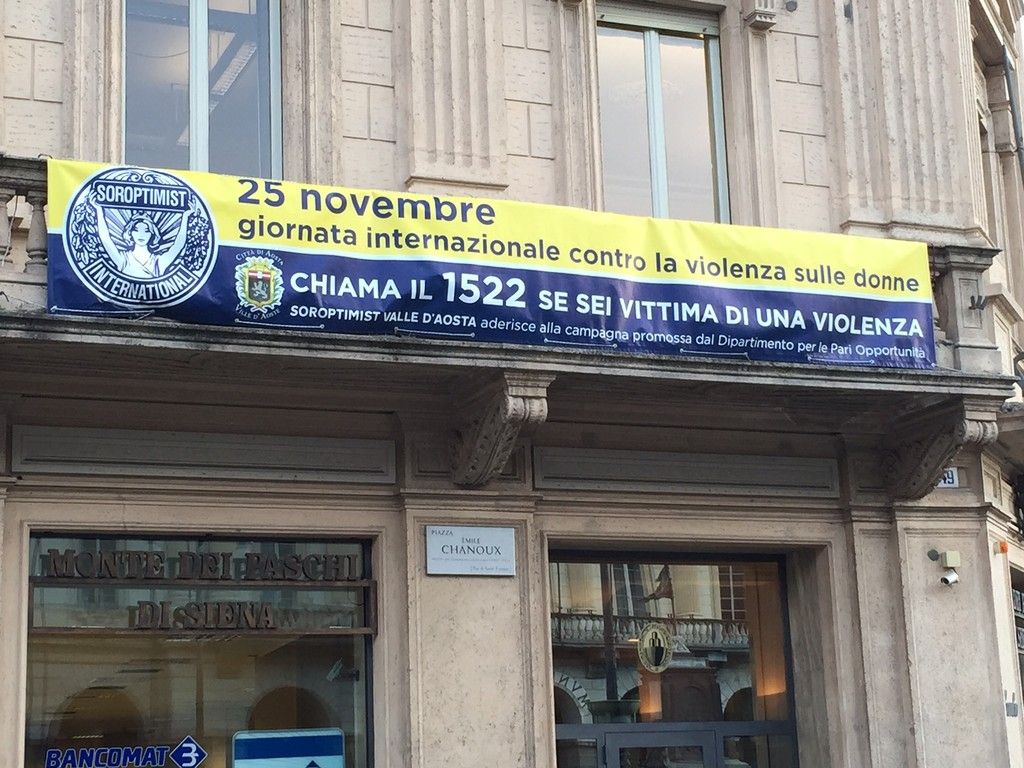 La Valle d'Aosta si mobilita per la Giornata mondiale contro la violenza sulle donne, promossa dal Dipartimento delle Pari opportunità, che sarà celebrata venerdì 25 novembre. In prima fila il Soroptimist, che in piazza Chanoux ha piazzato un megastriscione che invita le donne vittime di maltrattamenti e abusi a chiamare il numero antiviolenza 1522.