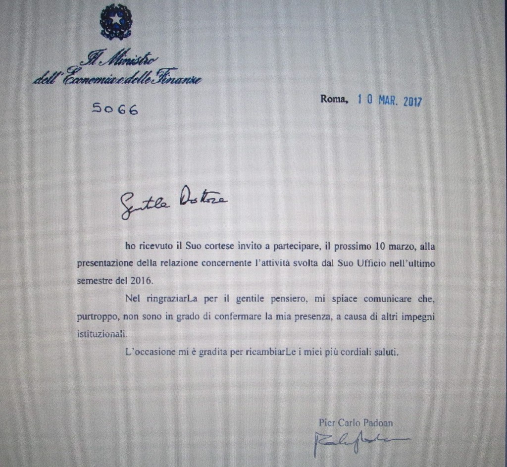 A fronte del recente incontro del prof. Formica con la stampa valdostana, per dare contezza del nostro operato, il Ministro dell’Economia e delle Finanze prof. Pier Carlo Padoan, invitato, ha inviato una lettera che pubblichiamo perché riteniamo opportuno che i valdostani ed i contribuenti italiani sappiano che questo Paese ha la fortuna di avere un Ministro tecnico competente, attento e nel contempo che la piccola Valle d’Aosta trova udienza ed attenzione nell’operato di una Struttura che vuole rompere lo steccato che divide la gente ed il fisco al di la delle tante parole perché quello che conta sono i fatti.