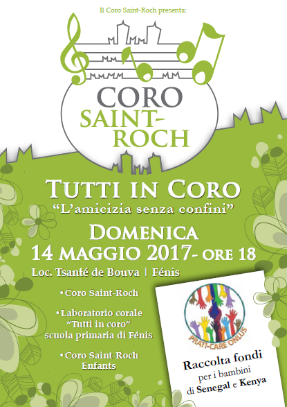 Il Coro Saint Roch di Fénis, diretto dal M° Piermario Rudda, organizza per DOMENICA 14 MAGGIO un Concerto di beneficenza a favore dei bambini del Senegal e Kenya. Nel pomeriggio si esibiranno oltre che ai padroni di casa del Coro Saint Roch, il Coro Saint Roch Enfants ed il Laboratorio Corale “Tutti in coro” delle scuole primarie di Fénis.