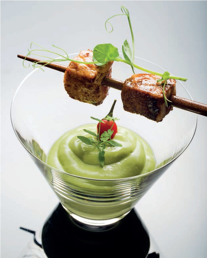 Sasate (spiedini) di pollo su bicchiere di crema d’avocado