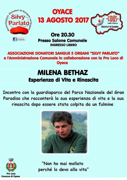 Milena Bethaz sarà protagonista di una serata organizzata dall’Associazione Donatori di Sangue e Organi Silvy Parlato, con il patrocinio dell’Amministrazione comunale e della Proloco, a Oyace il 13 agosto 2017 alle ore 20,30 presso il Salone Comunale. Un’occasione per raccogliere una testimonianza di impegno, di grande speranza e fiducia nella vita.