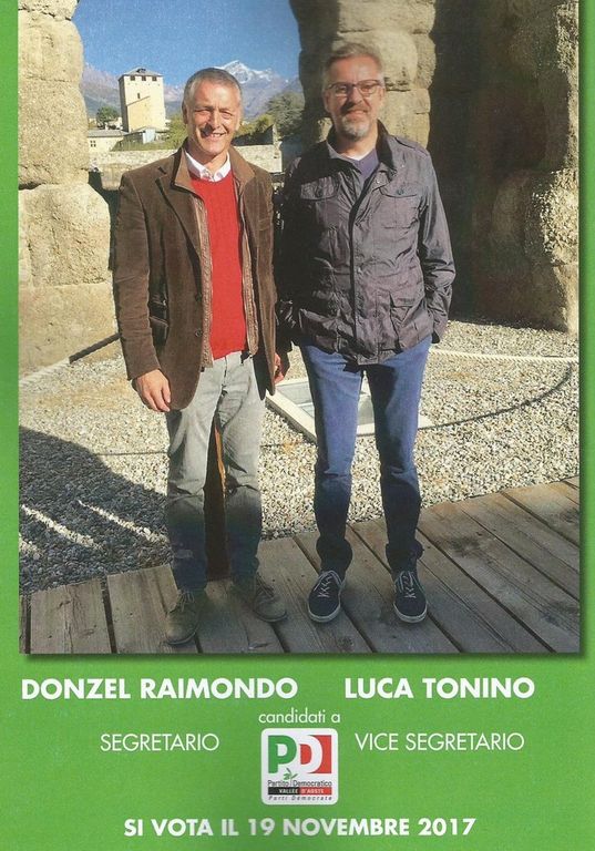 Il Pd è una forza progressista e deve operare per creare un’alleanza stabile con i movimenti autonomisti e, quindi, con l’Union Valdotaine. In estrema sintesi è il filo rosso della proposta politica che Raimondo Donzel e Luca Tonino, rispettivamente candidato segretario e vice segretario del Pd, propongono al congresso e alle primarie del Pd valdostano in programma il 19 novembre e alle quali si presentano anche altri due candidati alla segreteria: Giovanni Sandri e Sara Timpano.