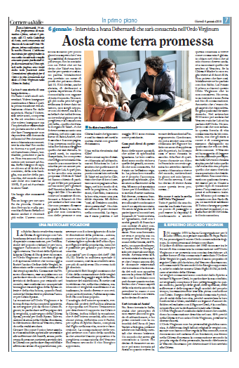 Ivana Debernardi, 34 anni,professoressa di matematica e fisica, sabato 6 gennaio, alle 15, nella cattedrale di Aosta, è stata consacrata dal vescovo di Aosta, mons. Franco Lovignana, nell’Ordo Virginum, prima valdostana nella diocesi.