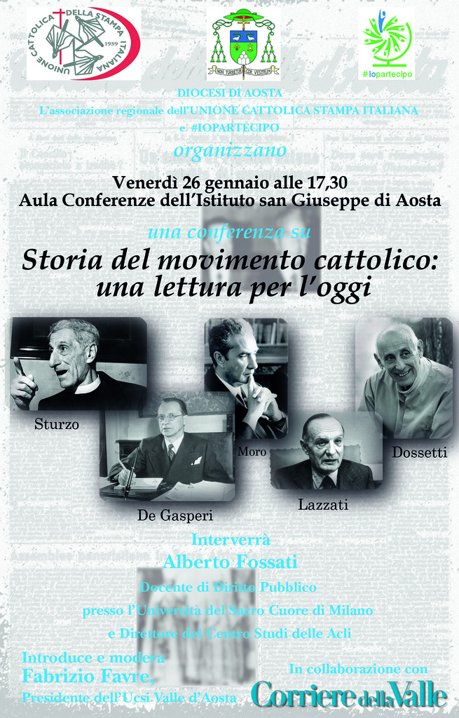 La «Storia del movimento cattolico: una lettura per l’oggi», è il tema di una conferenza al quale è annunciata la partecipazione di Alberto Fossati, Docente di Diritto Pubblico presso l’Università del Sacro Cuore di Milano e Direttore del Centro Studi delle Acli. Introduce e modera Fabrizio Favre, Presidente dell’Ucsi Valle d’Aosta.