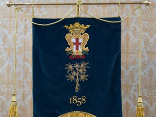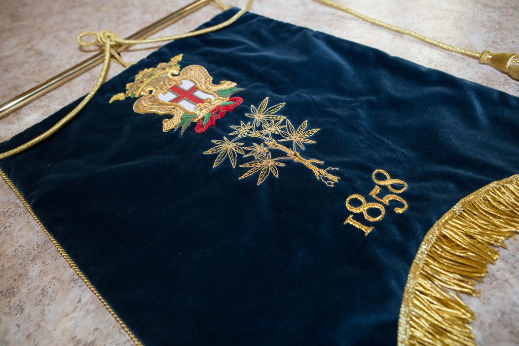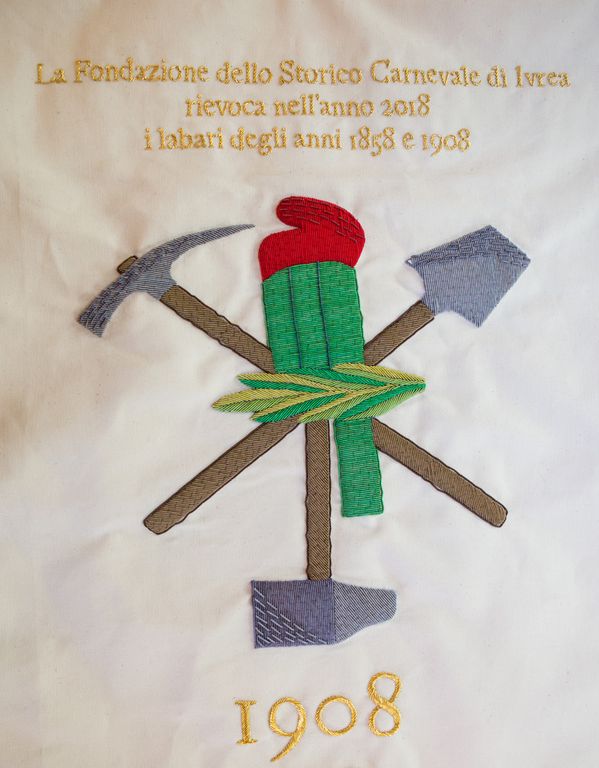 Donato al Carnevale nel 1908, questo prezioso drappo compie quest’anno 110 anni. Per preservarlo intatto si è scelto di farne realizzare uno nuovo in sostituzione. La creazione di quest’ultimo è stata oggetto di approfondito studio da parte di storici professionisti e di molte persone, memorie storiche e non solo, profondamente conoscitrici del Carnevale e delle sue tradizioni. Il vecchio labaro sarà conservato provvisoriamente presso il Museo Civico Pier Alessandro Garda di Ivrea per poi essere trasferito nell’Antico Palazzo della Credenza insieme con altri oggetti del passato.