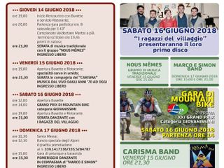 Venerdì 15, dopo la proposta di una cena a base di cervo in umido, ancora un concerto alle 21:30 serata con “Carisma band” ed il oro collaudatissimo spettacolo di musica dal vivo dagli anni ‘70 ad oggi. Il fine settimana della festa debutta con il Grand Prix di Mountain Bike categoria Giovanissimi e prosegue in serata con la presentazione da parte dell’orchestra I Ragazzi del villaggio del loro primo cd ‘Amici miei’.