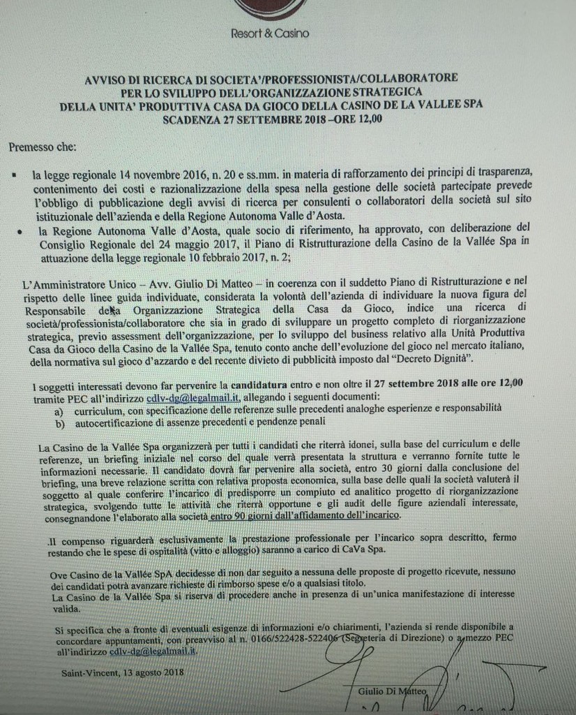 Infatti, è di questi giorni il bando per l’affida - mento dell’incarico ad un professio - nista per affidargli la respon - sabilità della direzione strategica. In soldoni Di Matteo è alla ricerca di qualcuno o qualcuna per la riorganizzazione strategica del casino. Ma dai tempi della giunta Marquis-Chatrian cosa è stato fatto? Meno soldi incassano al casino e più incarichi esterni vengono affidati da Giulio Di Matteo. Sarà curioso capire chi sarà il fortunato.