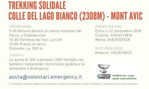 Il Gruppo Emergency Aosta organizza in collaborazione con la soc. coop. Habitat per domenica 23 settembre 2018, un TREKKING SOLIDALE nel Mont Avic al Colle del Lago Bianco(2308 mt) con dislivello c.a. 500mt.