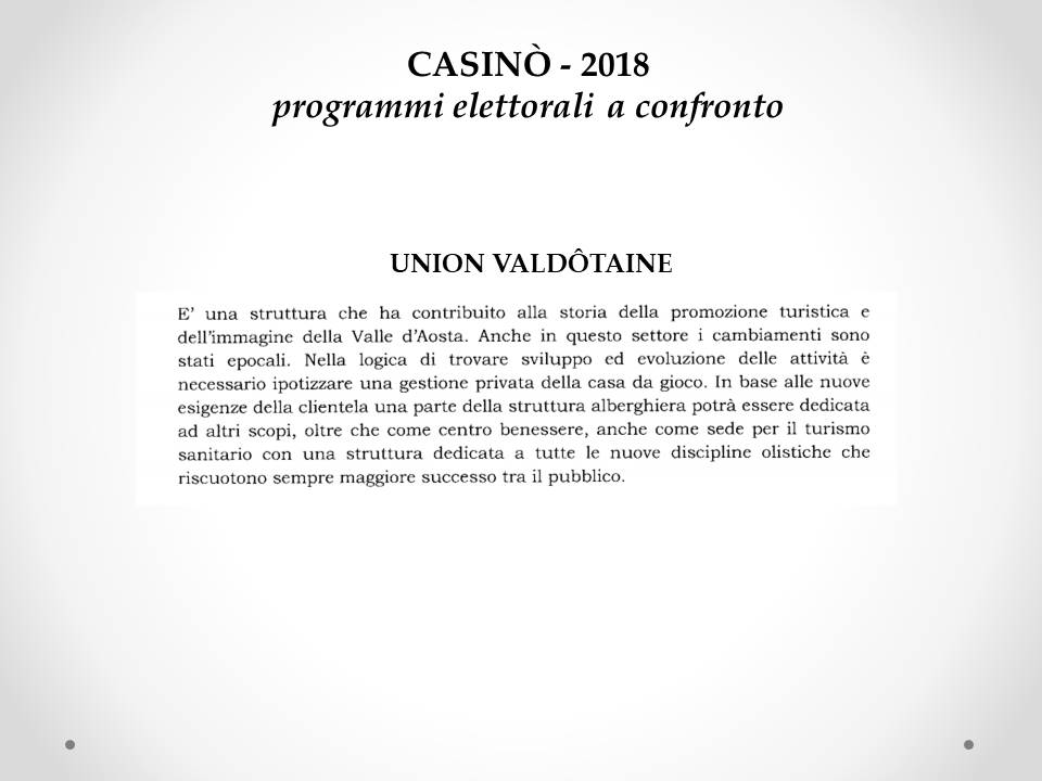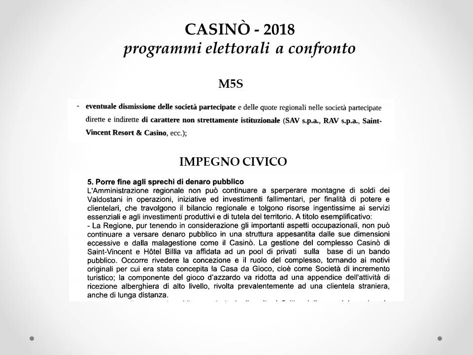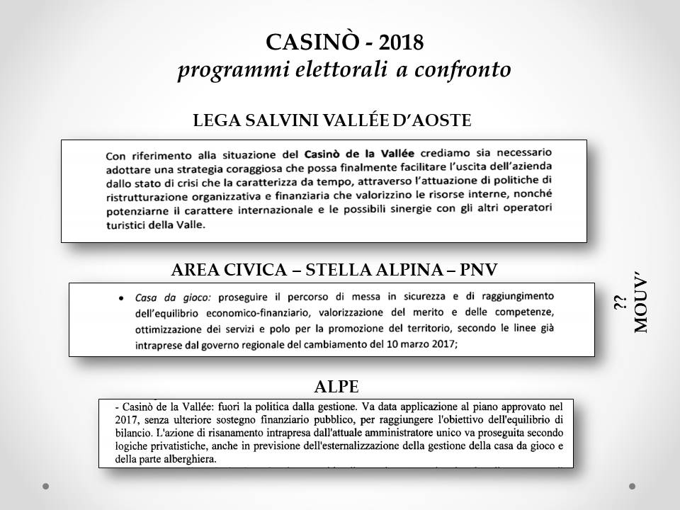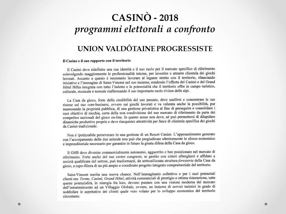 Pubblichiamo in basso alcune diapo che riassumo il programmi elettorali in materia di casino.