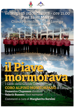 L’Amministrazione comunale in collaborazione con la Commissione di gestione della Biblioteca comunale organizza un concerto che riguarda la storia, quella recente che in questo 2018 compie un secolo: si tratta della Prima Guerra Mondiale, che sarà al centro di «Il Piave mormorava», concerto che vedrà protagonisti il Coro Alpino «Montorfano» di Coccaglio diretto da Domenico Clapasson e la voce narrante di Valerio Busseni, che leggerà i commenti curati da Margherita Barsimi.