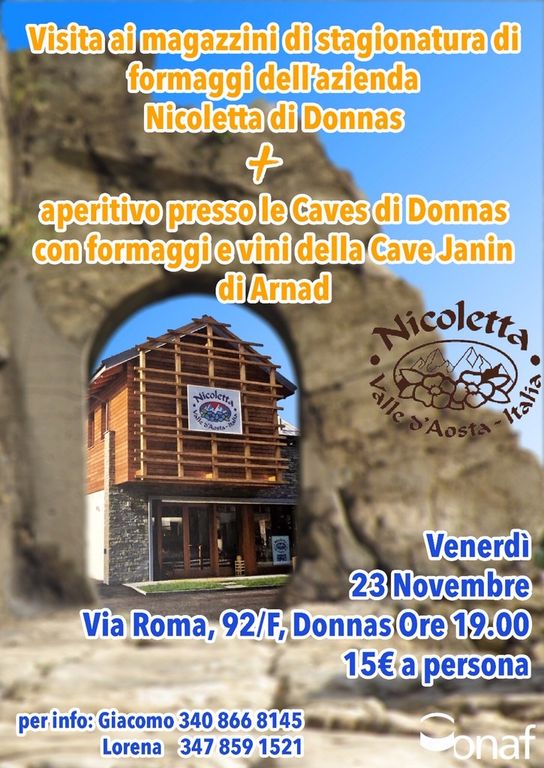 Il programma dell'aperitivo/assaggio aperto a chiunque sia interessato è a Donnas dove, dopo la visita ai magazzini di affinaggio e stagionatura dell'azienda Nicoletta, alle Caves saranno degustati formaggi con l'abbinamento di vini della cantina Janin.