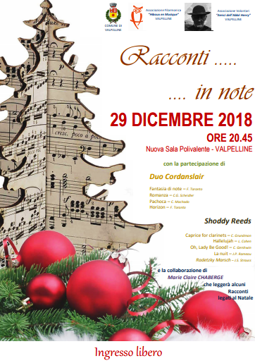 Un concertino di Natale un po' particolare fatto di note e ... racconti di Natale, è in programma sabato 29 dicembre nella Sala Polivalente di Valpelline (ex-centralina). Ore 20.45.