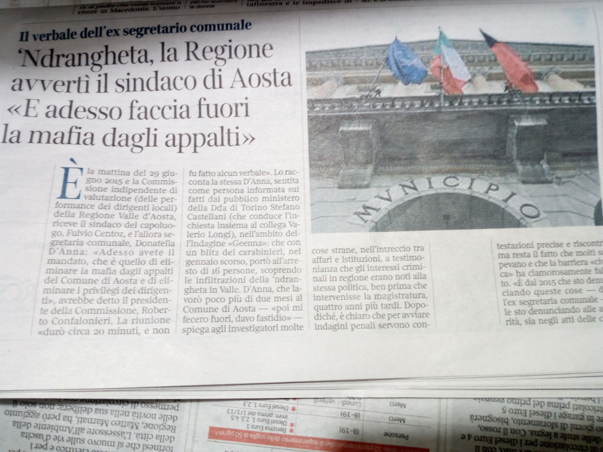 “Sindaco e vice (Fulvio Centoz e Antonella Marcoz, ndr) mi dissero che era persona poco pulita. Mi pare utilizzassero il termine mafioso, ma non sono sicura”. Il clamoroso virgolettato è di Massimiliano Nerozzi, giornalista del Corriere della Sera, che riporta – nel quotidiano di ieri lunedì 30 settembre - parte del verbale di Donatella d’Anna ex segretario comunale, sentita come persona informata sui fatti dal pm della Dda, nell’ambito dell’inchiesta Geenna. Inchiesta che nel gennaio scorso portò all’arresto di 16 persone tra cui il consigliere regionale Marco Sorbara che nel 2015 era assessore ai servizi sociali del Comune di Aosta