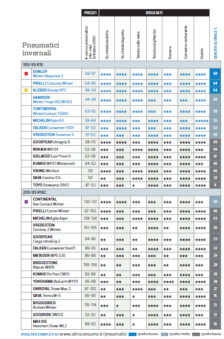 In cima alla classifica dei pneumatici per piccole auto (185/65 R15) si è posizionata Dunlop Winter Response 2 seguita da Pirelli Cinturato Winter. Miglior Acquisto nella categoria va alle gomme Kleber Krisalp HP3. Per quanto riguarda la categoria 205/65 R16C è Continental Van Contact Winter guadagna primo posto seguito da Pirelli Carrier Winter.