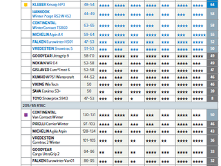 In cima alla classifica dei pneumatici per piccole auto (185/65 R15) si è posizionata Dunlop Winter Response 2 seguita da Pirelli Cinturato Winter. Miglior Acquisto nella categoria va alle gomme Kleber Krisalp HP3. Per quanto riguarda la categoria 205/65 R16C è Continental Van Contact Winter guadagna primo posto seguito da Pirelli Carrier Winter.
