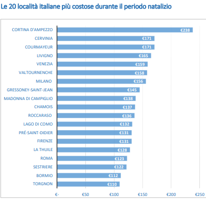 Ma Cortina D’Ampezzo è la prima in classifica con 238 euro notte. La località italiana più desiderata e frequentata da italiani e stranieri durante le vacanze natalizie è proprio Cortina d'Ampezzo. Motivo per il quale il prezzo medio di un appartamento o chalet per le vacanze arriva a costare in media 238€ a notte. D’altra parte “la perla delle Dolomiti” offre ai suoi visitatori più di 140 km di piste da sci, circa 80 km di sentieri di fondo per divertirsi durante il giorno e una vasta offerta di locali per scatenarsi la notte.