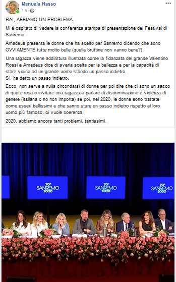 Mi è capitato di vedere la conferenza stampa di presentazione del Festival di Sanremo. Amadeus presenta le donne che ha scelto per Sanremo dicendo che sono OVVIAMENTE tutte molto belle (quelle bruttine non vanno bene?).