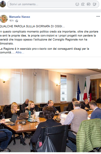 I lavori della II Commissione consiliare permanente ‘Affari Generali’ sul Bilancio sono talmente interessanti che c’è qualche consigliere regionale (Manuela Nasso M5S) durante i lavori di questa mattina, ha commentato la conferenza stampa di presentazione del Festival di Sanremo, tanto che le sue opinioni le ha diffuse urbi et orbi sui social. Forse gli emendamenti al bilancio sono secondari.
