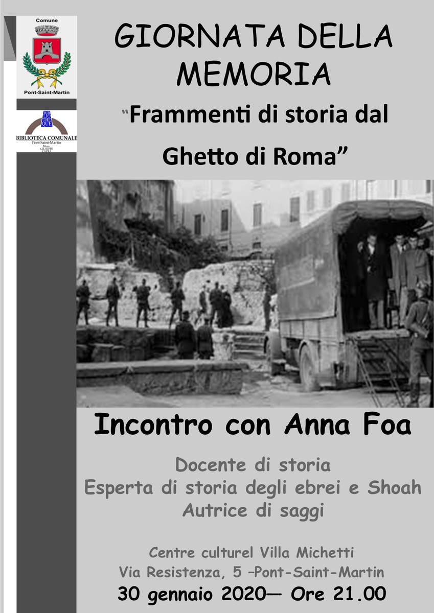 icata al Ghetto di Roma la Biblioteca di Pont-Saint-Martin non intende fare qualcosa per dovere, ma desidera che attraverso le parole della dott.ssa Foa ciascuno possa lasciarsi interpellare in profondità, sentire la propria responsabilità, perché se non si ricorda ciò che accadde agli Ebrei in quella che è stata l'epifania del male, se non ci si lascia abitare da quell'evento non si può provare orrore per ciò che può di nuovo accadere.