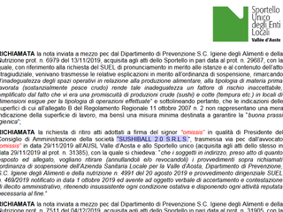 Il tutto, come si legge nell'ordinanza consultabile all'Albo Pretorio del Comune di Courmayeur, è da ricondurre ad un controllo compiuto nell’agosto 2019 da personale di vigilanza, ai sensi del Reg. CE n. 882/2004 sull’igiene dei prodotti alimentari. Inoltre i controllori accertarono la presenza di un menu scritto, proponente piatti tipici della cucina giapponese,“sushi” “sashimi”.