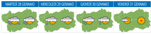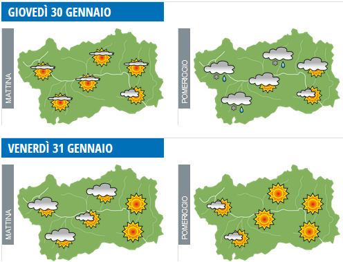 Il Centro Funzionale Meteo della Regione Autonoma Valle d'Aosta rileva che circolazione a grande scala è caratterizzata sino ad almeno martedì prossimo da correnti atlantiche occidentali, a tratti più umide ed intense, e miti a partire da sabato. Il tempo sulla nostra regione sarà pertanto variabile, specie sui settori occidentali, più interessati da nuvolosità e precipitazioni, ed in genere più soleggiato ed asciutto sui settori orientali; da sabato sensibile aumento delle temperature in montagna.