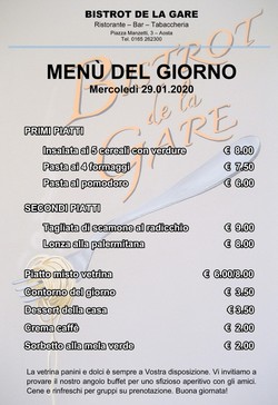 La rassegna stampa di oggi è offerta dal Bistrot de la Gare di Aosta. Il miglior modo per iniziare la giornata: leggere i giornali e fare colazione al Bistrot de la Gare. Professionalità e competenza nella caffetteria, eccellenza nella ristorazione, cortesia nei servizi. Bistrot de la Gare in piazza Manzetti 3, aperto fino alle ore 21