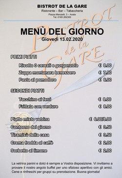 La rassegna stampa di oggi è offerta dal Bistrot de la Gare di Aosta. Il miglior modo per iniziare la giornata: leggere i giornali e fare colazione al Bistrot de la Gare. Professionalità e competenza nella caffetteria, eccellenza nella ristorazione, cortesia nei servizi. Bistrot de la Gare in piazza Manzetti 3, aperto fino alle ore 21