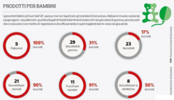 Di seguito alcuni dei risultati principali: - Su 12 carica batterie USB, 12 powerbank e 12 adattatori da viaggio, ben 26 prodotti su 36 sono pericolosi, possono dare la scossa o causare incendi. - In 9 giocattoli per bambini su 29 (31%) sono state trovate quantità illegali di ftalati (fino a 200 volte il limite legale). Bocciato il 91% dei trucchi per bambini. - l’88% capi d’abbigliamento per bambini testati non rispettavano gli standard europei, con possibili rischi per la salute e l’incolumità dei piccoli. Tra quelli testati, alcune categorie di prodotto sono state bocciate nella totalità dei casi.