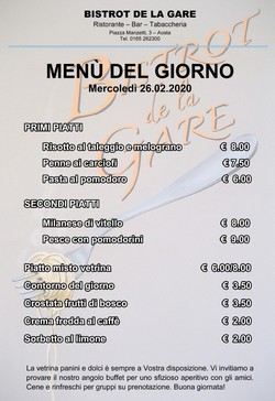 La rassegna stampa di oggi è offerta dal Bistrot de la Gare di Aosta. Il miglior modo per iniziare la giornata: leggere i giornali e fare colazione al Bistrot de la Gare. Professionalità e competenza nella caffetteria, eccellenza nella ristorazione, cortesia nei servizi. Bistrot de la Gare in piazza Manzetti 3, aperto fino alle ore 21
