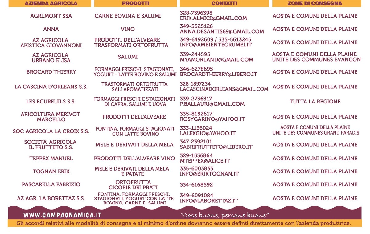 “Nel pieno rispetto delle norme sanitarie in atto, i nostri imprenditori si stanno attivando per attivare il servizio a domicilio che offre la possibilità di prenotare e farsi recapitare direttamente a casa la spesa” spiegano Alessio Nicoletta e Elio Gasco, presidente e direttore di Coldiretti Valle d’Aosta.