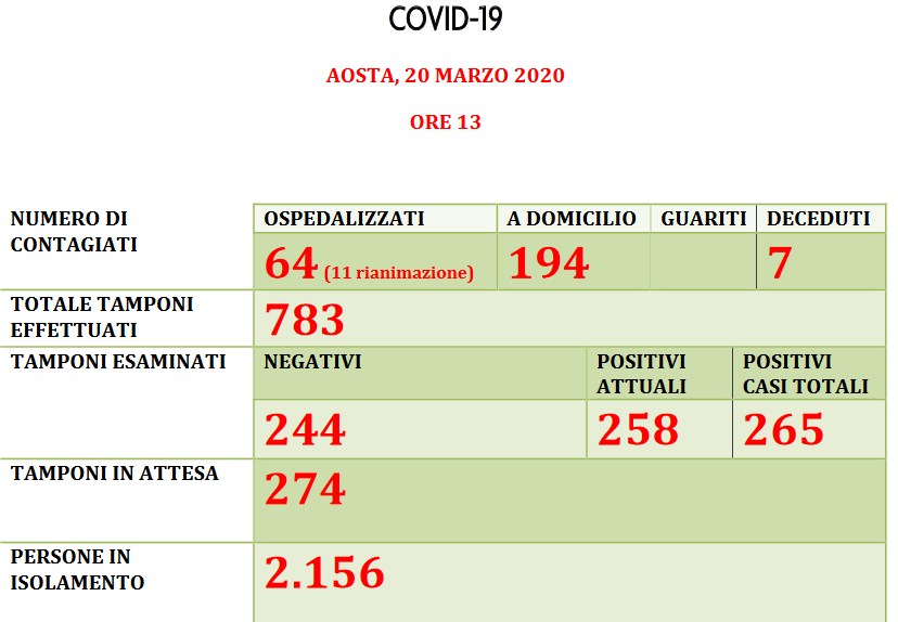 Tra i contagiati ci sono 63 ricoverati all'ospedale Parini di Aosta di cui 17 in Rianimazione, mentre gli altri 195 sono in isolamento domiciliare. Infine sono 2.230 le persone per le quali i sindaci hanno predisposto un'ordinanza per isolamento domiciliare precauzionale, sotto sorveglianza medica.