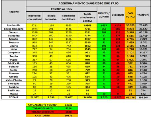 Coronavirus in Italia, 69.176 casi totali e 6.820 morti. Il bollettino del 24 marzo