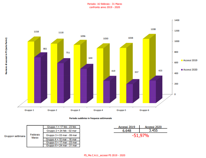 Nel periodo dell’emergenza Covid-19, ovvero tra il 03 e il 31 marzo 2020, sono stati registrati 1.843 accessi in Pronto soccorso, con un’affluenza settimanale da un massimo di oltre 600 utenti a un minimo di circa 350; nello stesso periodo dell’anno precedente, gli accessi nel corso della settimana non sono mai scesi sotto le 1.000 unità, con un picco di 1.208 (per un totale di 4.302).