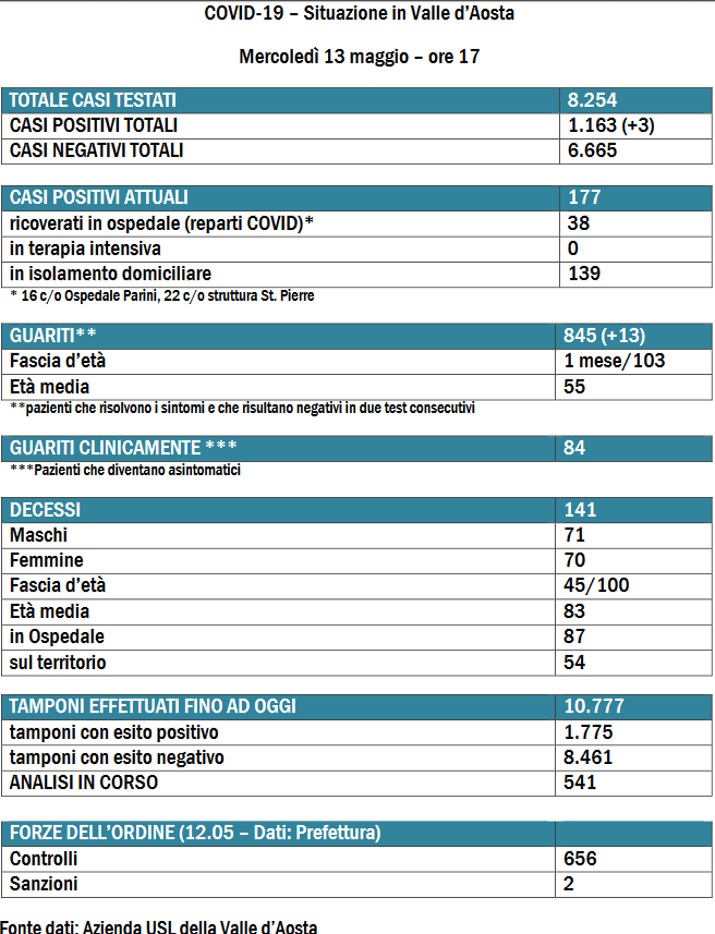 Sono tre nella nostra regione i nuovi casi di contagio da coronavirus Covid-19 registrati nelle ultime 24 ore: due in più rispetto a ieri. Il bollettino di aggiornamento dell'Unità di crisi segnala inoltre un nuovo decesso; i morti salgono dunque a 141 ovvero 71 uomini e 70 donne, tra i 45 e i 100 anni (età media 82 anni). Salgono a 845 i guariti, che oggi sono tredici più di ieri con un trend di crescita nuovamente in aumento rispetto ai giorni scorsi.