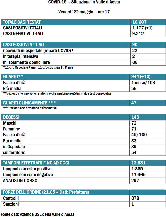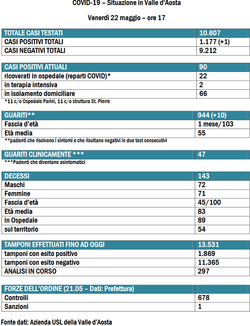 Nelle ultime 24 ore è stato registrato un solo nuovo caso positivo di coronavirus in Valle d'Aosta. E' quanrto riporta il bollettino dell'Unità di crisi. I morti sono sempre 143 (72 uomini e 71 donne, tra i 45 e i 100 anni, età media 83 anni). I contagiati sono 1.177 dall'inizio dell'epidemia e 90 quelli attuali. I guariti salgono a 944 (10 in più di ieri).