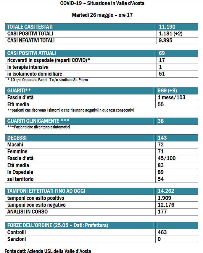 I contagiati salgono a 1.181 dall'inizio dell'epidemia e 69 quelli attuali. I guariti sono 969 (nove in più di ieri). Infine i pazienti ricoverati in ospedale sono 18 di quali uno in Terapia intensiva, mentre gli altri 51 contagiati sono invece in isolamento domiciliare.