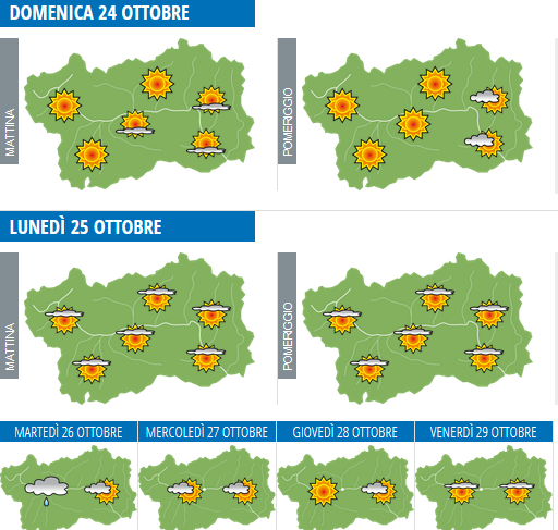 Il Centro Funzionale Meteo della Regione Autonoma Valle d'Aosta segnala: Correnti atlantiche determinano tempo relativamente fresco in Valle d'Aosta fino a lunedì, con alternanza di schiarite e annuvolamenti, mentre tra martedì e mercoledì si avrà una parziale rimonta anticiclonica; in seguito è probabile la discesa di una saccatura dal nord Atlantico.