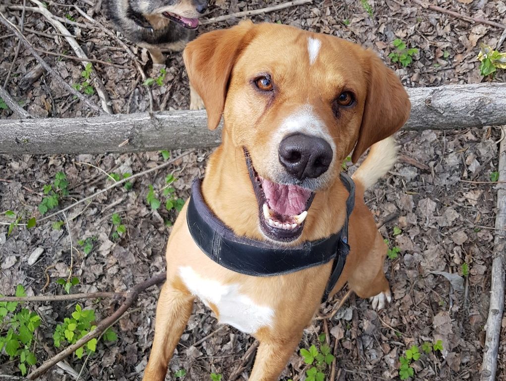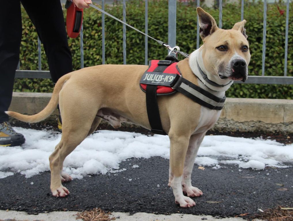 Il cane seduto si chiama Joy, ha 8 mesi, taglia medio grande, non si trova in struttura; il cane in piedi beige e bianco si chiama Athos e il cane fulvo preso dall'alto si chiama Trip. A parte Joy possono essere affiancati da un volontario di riferimento o un educatore. Cercano casa.