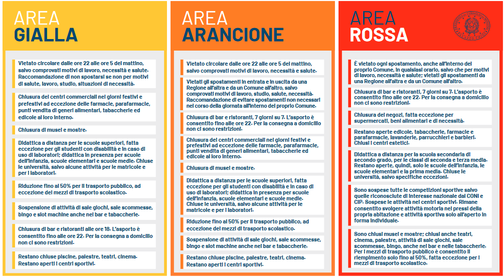 Nelle regioni individuate ad alto rischio, quindi dove l’indice dei contagi è elevato, è vietato ogni spostamento in entrata e in uscita dai confini territoriali. Anche all’interno della stessa regione gli spostamenti sono vietati salvo che per comprovate esigenze lavorative o situazioni di necessità o per motivi di salute. La didattica a distanza è scattata dalla seconda media salvo che per i disabili. Restano chiusi bar, pasticcerie, ristoranti, e tutti i negozi che non vendono beni essenziali. Resta consentita la sola ristorazione con consegna a domicilio e la ristorazione con asporto. Le consumazioni devono essere fatte obbligatoriamente a casa. Restano aperte le industrie così come farmacie e supermercati. Nessuna serrata infine per i servizi alla persona.