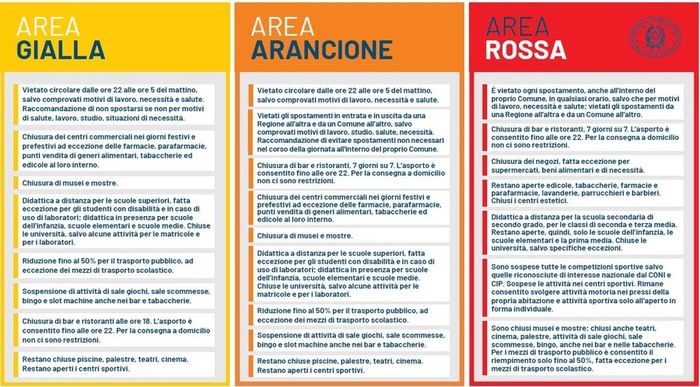 Una zona gialla 'rinforzata' nei giorni feriali - ovvero con il divieto di spostamento tra le regioni e la conferma della regola che prevede la possibilità di spostarsi verso un'altra abitazione nella regione per massimo due persone - e una zona arancione nel fine settimana.