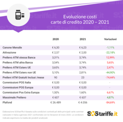 Possedere una carta di credito comporta costi differenti che possono subire variazioni di diverso tipo in base al singolo istituto di credito: dal confronto sull’evoluzione dei costi da sostenere effettuato da SOStariffe.it emergono alcuni cambiamenti significativi rispetto al 2020. Se il canone, l’attivazione e il prelievo massimo si sono ridotti, i prezzi sono invece in aumento per alcune tipologie di prelievi e commissioni.