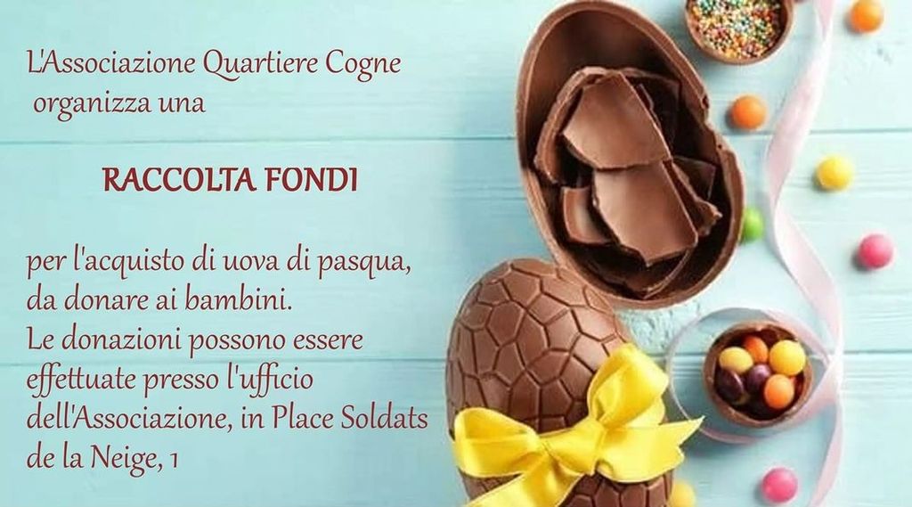E' organizzata dallo staff dell'Associazione quartiere Cogne-Aqc di Aosta una raccolta fondi per l'acquisto di Uova di Pasqua da donare ai bambini delle famiglie più bisognose. "Le donazioni possono essere effettuate nella nostra sede in place Soldats de la Neige 1" spiega Rosalia Ventrini, presidente dell'Aqc. Per informazioni è possibile contattare la mail associazionequartierecogne@gmail.com oppure il cel. 3274580818.