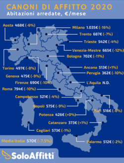 I prezzi medi in semicentro hanno subìto solo una lieve variazione negativa grazie alla salita del canone dei quadrilocali cresciuto del 3% (da 630 euro di media nel 2019 a 650 a fine 2020) che ha compensato il -5% dei monolocali (350 euro al mese) e il -4% di bilocali e trilocali. In centro prezzi invariati grazie – anche in questa zona - alle metrature più grandi come i quadrilocali che hanno visto incrementare il proprio prezzo del 4% raggiungendo i 700 euro mensili, all’opposto dei bilocali (-4% a 500 euro) e dei trilocali (-2%).