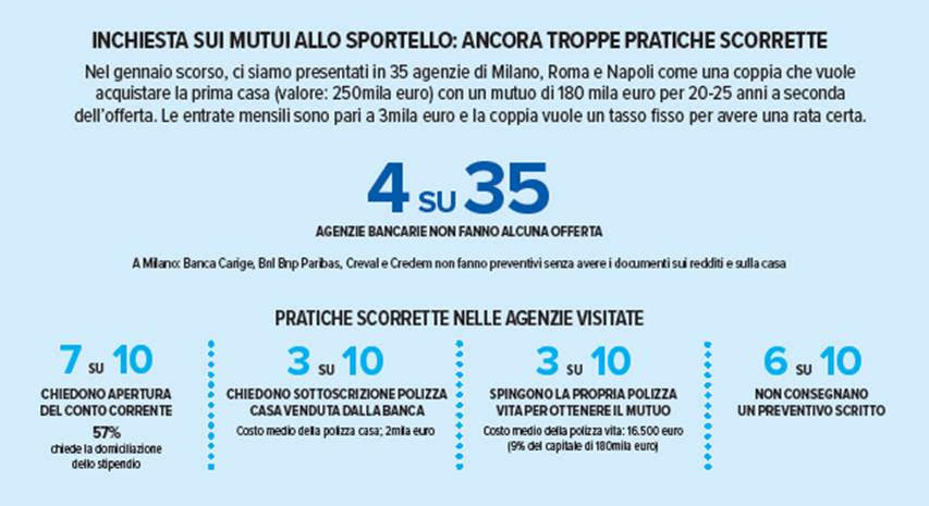 In primis, Altroconsumo ha condotto un’indagine in 35 agenzie bancarie di Milano, Roma e Napoli, per verificare le offerte proposte a una coppia, con due stipendi (3mila euro al mese in tutto) che vuole acquistare la prima casa, del valore di 250mila euro, con mutuo di 180mila euro per una durata di 20/25 anni, a seconda dell’offerta, a tasso fisso. Altroconsumo è riuscito ad ottenere dei preventivi scritti soltanto 4 volte su 10 e non senza imbattersi in pratiche scorrette verso i consumatori. Il 30% delle offerte include la sottoscrizione delle polizze casa o vita vendute dalla stessa banca, che in sede di colloquio sono state indicate come fondamentali per l’ottenimento del mutuo. I costi di queste polizze sono, inoltre, piuttosto onerosi: la polizza vita a copertura del credito per rischio di morte o perdita del lavoro può, infatti, arrivare anche a 25mila euro (media 16.500 euro), mentre il costo medio della polizza casa è di 2mila euro. Nel 70% dei casi, inoltre, le agenzie richiedono l’apertura di un conto corrente per la sottoscrizione del mutuo e il 57% di queste chiede anche la domiciliazione dello stipendio.